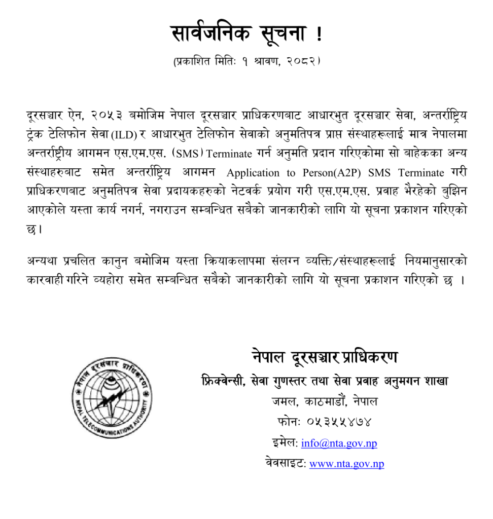 बिहीबार एक सूचना प्रकाशित गर्दै प्राधिकरणले अनुमति नपाएका संस्थाहरूले दूरसञ्चार ऐन, २०५३ विपरीत अनुमति प्राप्त सेवा प्रदायकहरूको नेटवर्क दुरुपयोग गरी (ग्रे रुट मार्फत) अन्तर्राष्ट्रिय एसएमएस प्रवाह गरिरहेको जनाएको हो ।