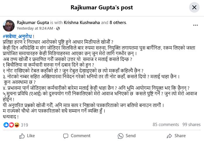 काठमाडौँ । संघीय मामिला तथा सामान्य प्रशासनमन्त्री राजकुमार गुप्ताले आफूमाथि लागेको ७८ लाख रुपैयाँ घुस लेनदेनको आरोपलाई पूर्ण रूपमा अस्वीकार गरेका छन् । उनले प्रविधिको दुरुपयोग गरेर आफ्नो चरित्रहत्या गर्ने उद्देश्यले अडियो बनाइएको दाबी गर्दै आरोप प्रमाणित भए नागरिकता त्यागेर देश छाड्ने घोषणासमेत गरेका छन् ।