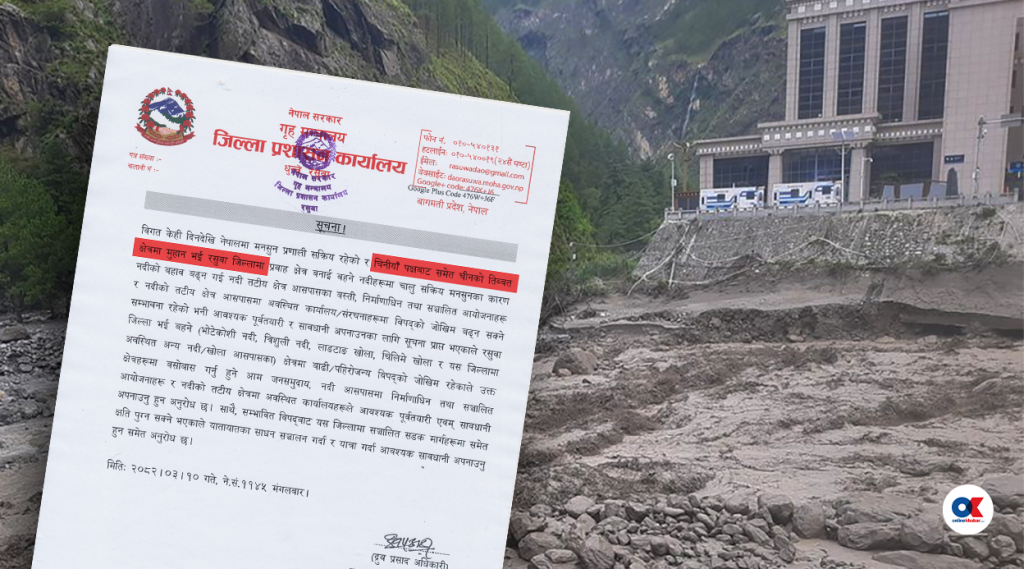 मनसुन सक्रिय भएको र चीनले समेत सावधानी अपनाउन भनेकाले भोटेकोशी नदी, त्रिशूली नदी, लाङटाङ खोला, चिलिमे खोला र अन्य नदी/खोला आसपासका क्षेत्रमा बाढी-पहिरोजन्य विपद्को जोखिम रहेकाले सतर्कता अपनाउन अनुरोध गर्दै सहायक प्रमुख जिल्ला अधिकारी द्रुवप्रसाद अधिकारीले सूचना जारी गरेका थिए ।
