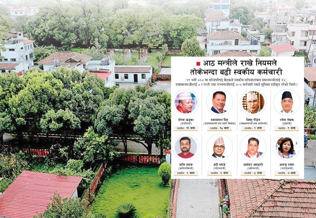 स्वकीय सचिवालयका धेरैजसो नियुक्तिहरू कानुनी प्रक्रिया नपु¥याई गरिएको पाइएको छ। मन्त्रीहरूले आफन्त, पार्टी कार्यकर्ता वा विश्वासपात्रलाई सचिवालयमा नियुक्त गरेर अनधिकृत रूपमा सवारी साधन, भत्ता, भ्रमण सुविधा लगायत प्रयोग गरेका छन्। कतिपय सचिवालयमा मन्त्रालयको निर्णय प्रक्रियामा समेत हस्तक्षेप भइरहेको छ।